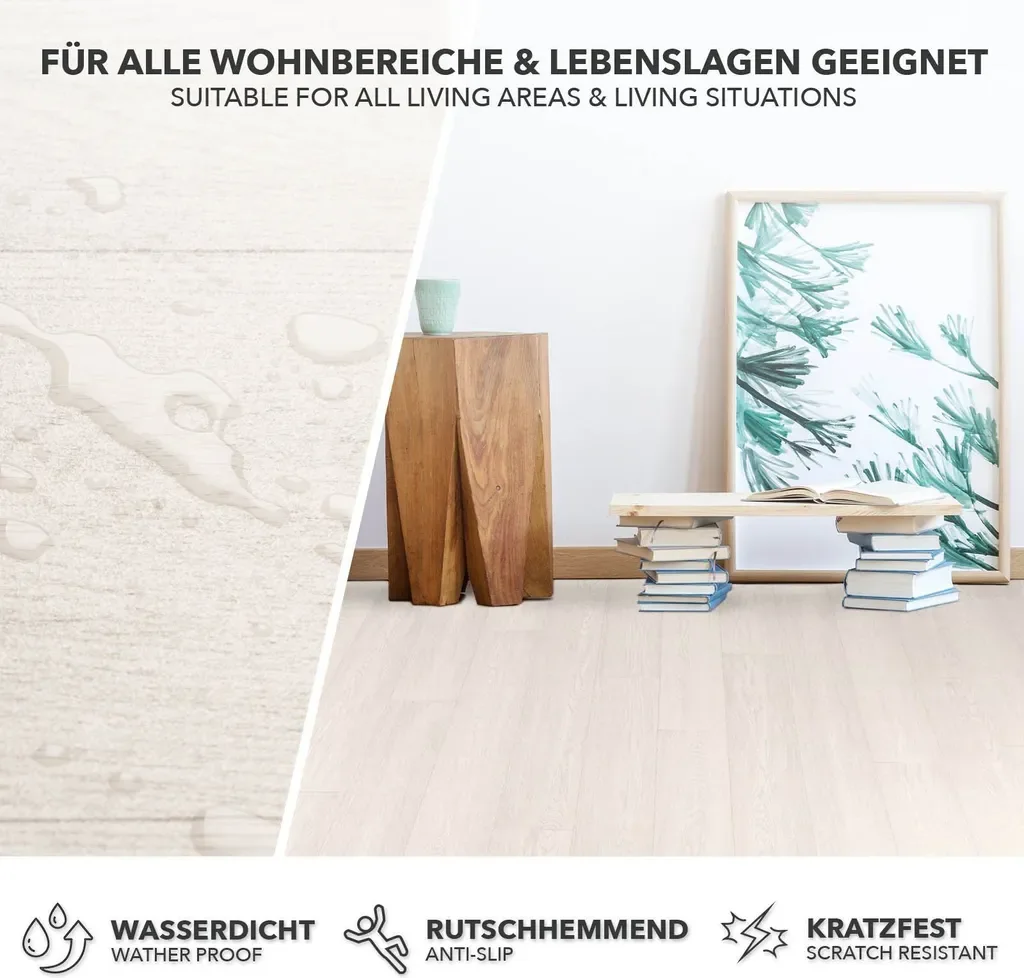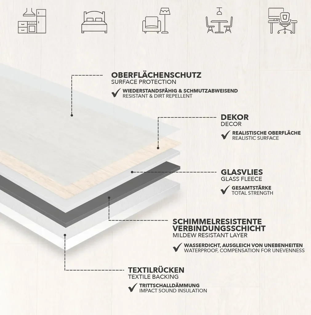 - Strapazierfähige Nutzschicht: 0,15 mm und Verschleißgruppe T – für dauerhafte Optik.