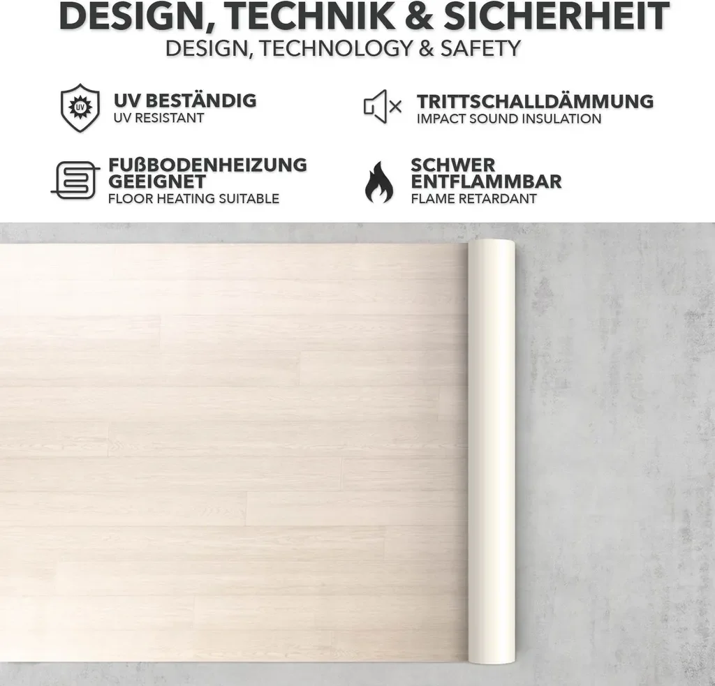 - Stuhlrollenfest: geeignet für rollende Belastungen – praktisch im Arbeitsbereich.