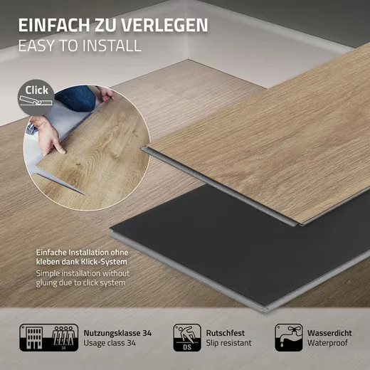 - Klicksystem: Für eine einfache und zügige Verlegung – Elemente werden passgenau verbunden.