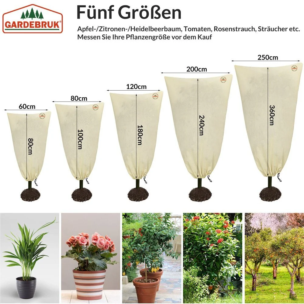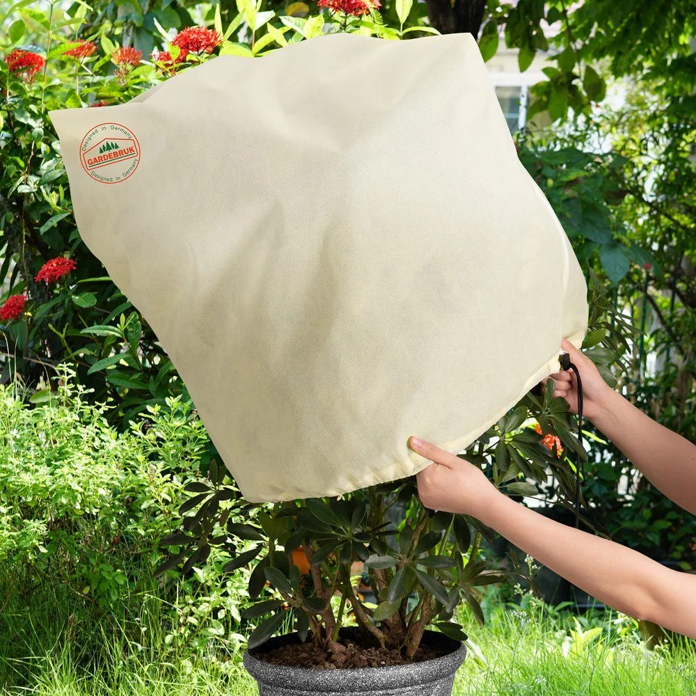 Das Gardebruk Winterschutzvlies als Kübelpflanzensack schützt Pflanzen in der kalten Jahreszeit vor Frost, Wind und Witterung. Junge Triebe und Knospen bleiben beim Überziehen dank seitlichem Reißverschluss besser intakt, während Sträucher, Tomatenpflanzen und auch mittelgroße Bäume sicher abgedeckt sind.