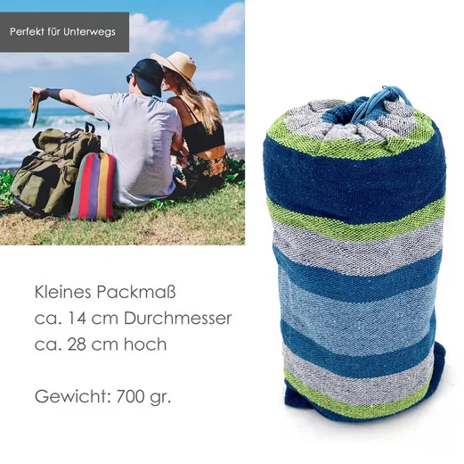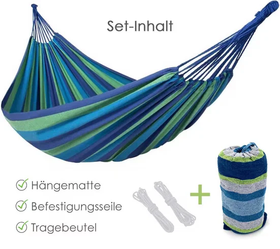 Die Hängematte eignet sich für den Einsatz an Hängemattenständern, an Haken oder – mit den beiliegenden Seilen – direkt am Baum. Indoor wie Outdoor gedacht, besonders naheliegend auf Balkon und im Garten. Wettertauglich, fleckunempfindlich, atmungsaktiv und schnelltrocknend: pflegeleicht im Alltag. Klein verpackt im Beutel mit ca.-Maßen; praktisch beim Campen, Wandern oder auf dem Festival. Hinweis: Bei allen Maßangaben handelt es sich um ca.-Maße.